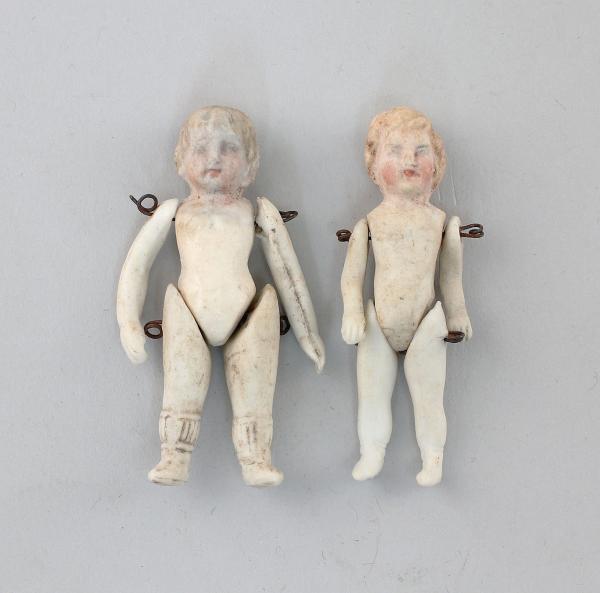 um 1900, modelliertes Haar, Biskuitporzellan, Arme und Beine mit Draht aufgezogen, anmodelierte Schuhe und Strümpfe, teils handbemalt, Größe: 6,5 cm, Altersspuren