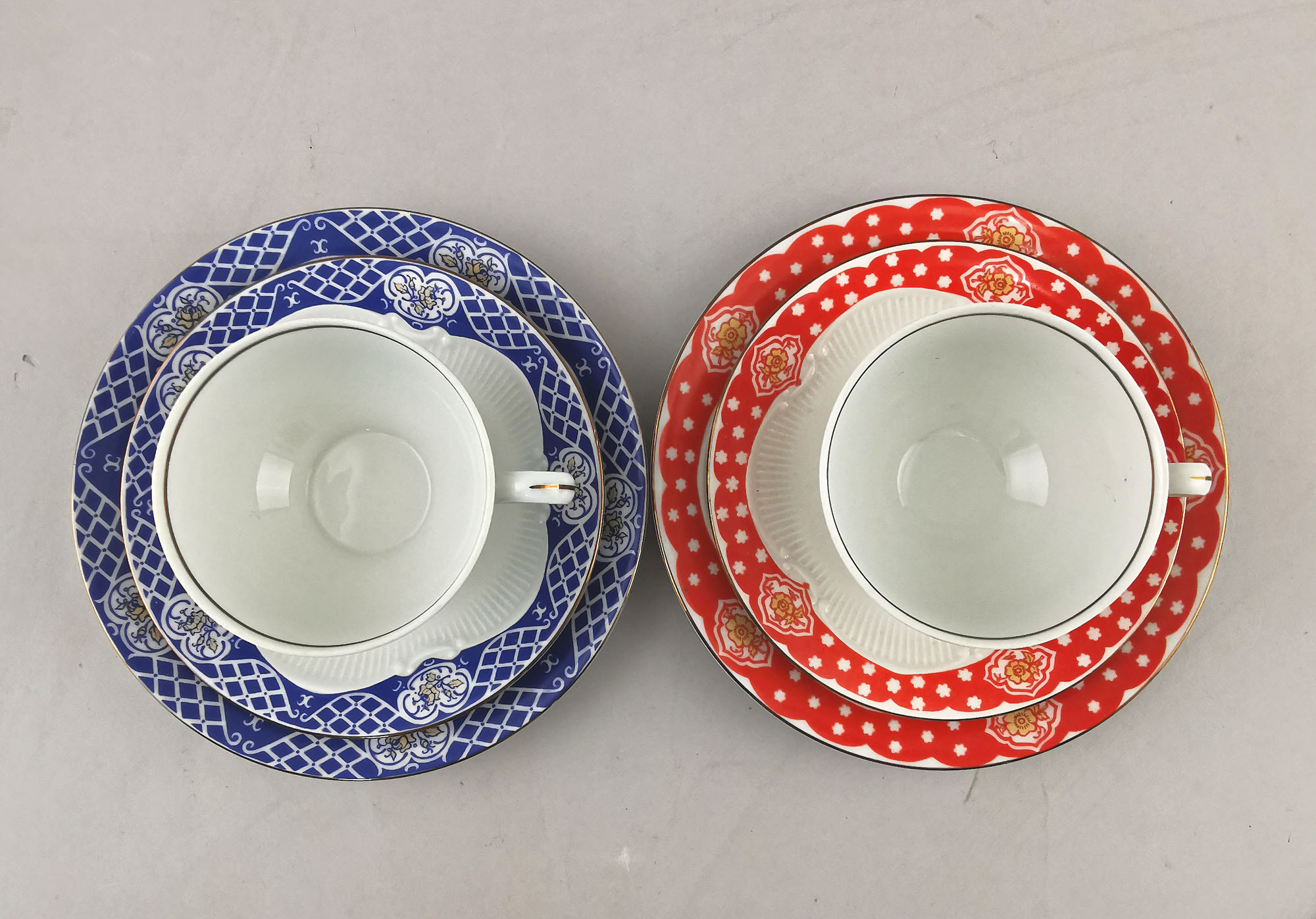 gemarkt Lettin, 70er Jahre, Sachsen, Weißporzellan, stilisiertes Floraldekor in Rot und Blau, leichte Gebrauchsspuren, 19x6cm