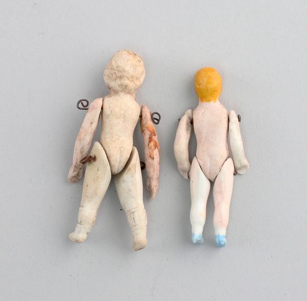 um 1900, modelliertes Haar, Biskuitporzellan, Arme und Beine mit Draht aufgezogen, anmodelierte Schuhe und Strümpfe, Handbemalt, Größe: 6,5 cm und 5,7 cm