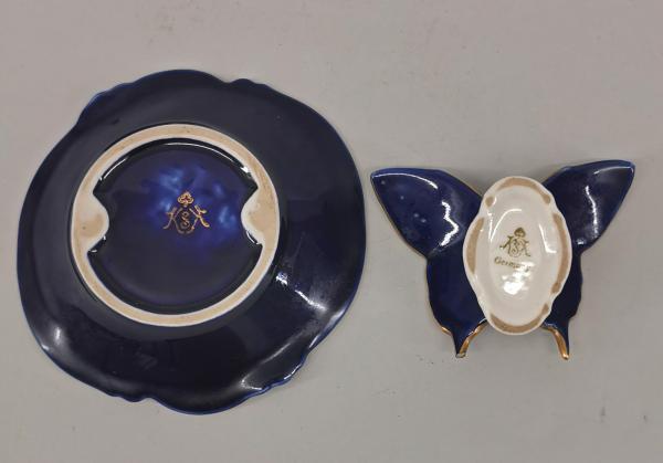 gemarkt Rudolf Kämmer, Volkstedt, Thüringen, um 1950, jeweils Goldbemalung von Hand auf kobaltblauem Fond, Schmetterling bestoßen, 8x4cm, 11,5x2,5cm