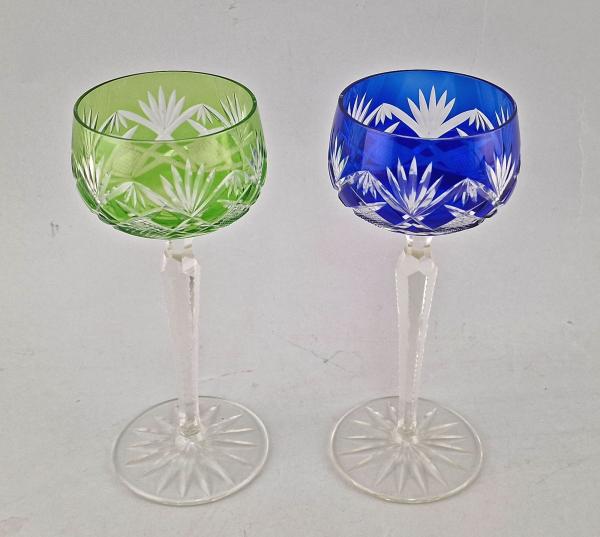 farbloses Glas, Kuppa grün bzw. blau überfangen, handbeschliffen, H 19,5 cm, D 7,5 cm