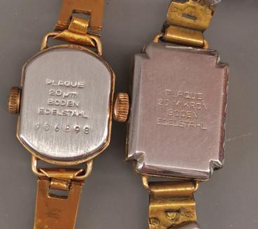 UMF, Ruhla, Mitte 20. Jh., Gehäuse vergoldet (20 Mikron), Boden Edelstahl, rundes bzw. quadratisches Zifferblatt mit Schriftzug "Ruhla", mech. Werke mit Handaufzug, Werke laufen, ca. 17 x 17 mm, L ca.15 cm, Gebrauchsspuren