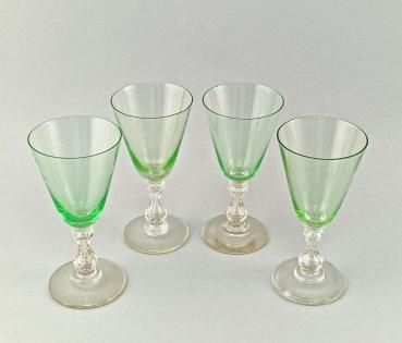alt, konische Kuppa aus Uranglas, auf farblosem Balusterstiel und Fuß, H 14 cm, 3 Gläser mit kleinen Chips