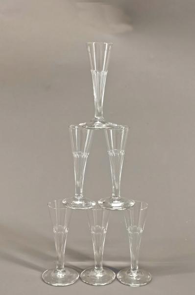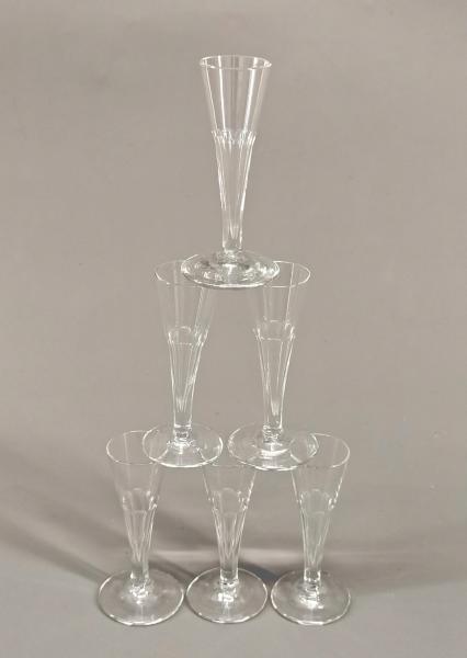 6 Likörgläser, Deutsch 2. Hälfte 19. Jh, farbloses Glas, Stiel vielfach facettiert geschliffen, H 9 cm, 1 x kleiner Chip an Mündung