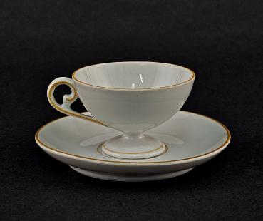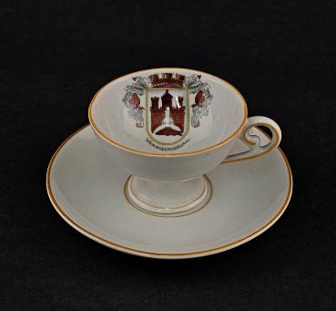 UT gemarkt B.L. Leuchtenburg, farbig dekoriert, handausgemalt, Goldstaffage, Wappendarstellung, UT D 11 cm, Tasse 8,5 x 4,5 cm