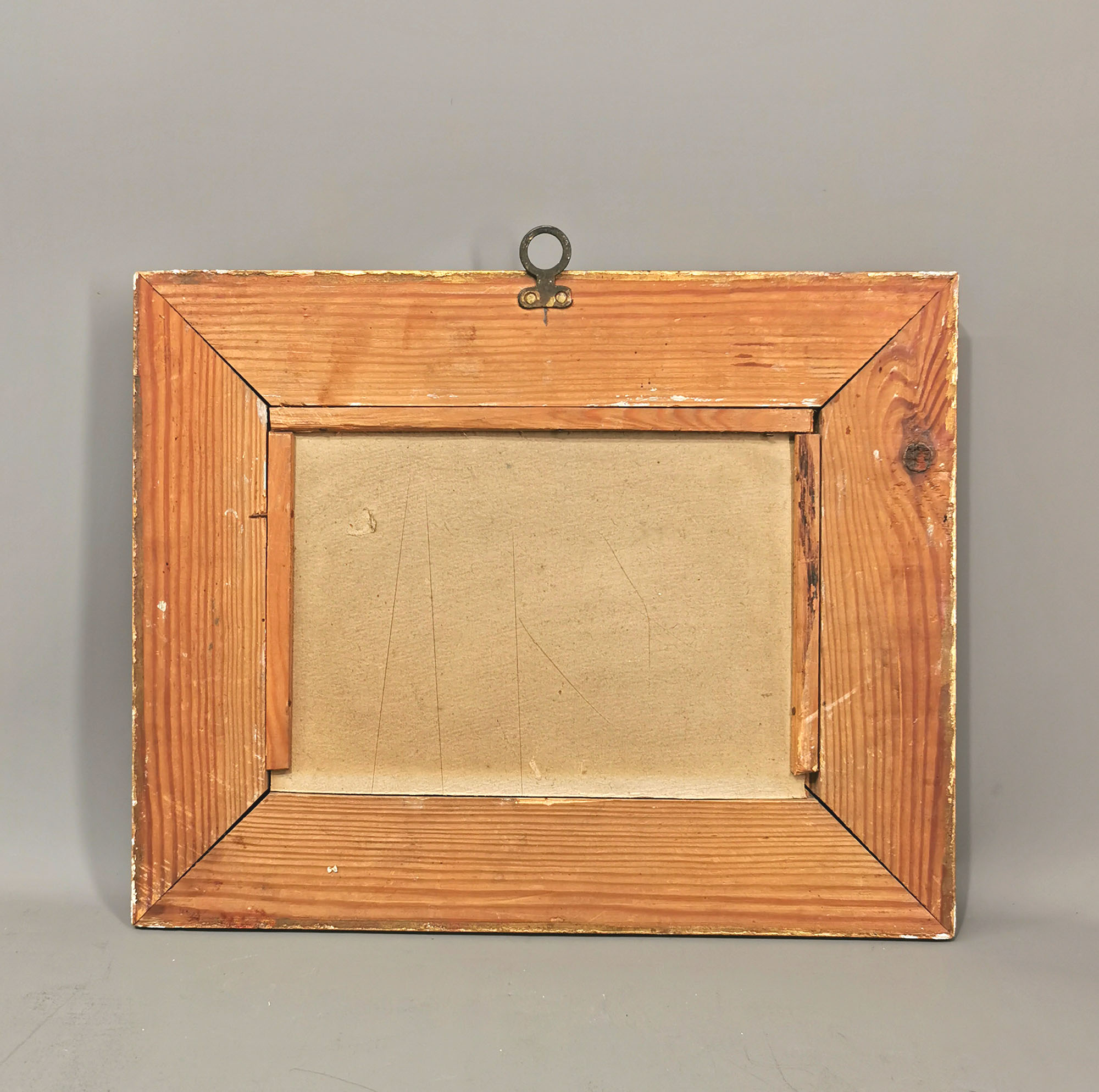 unsigniert, um 1880/1900, Öl/Maltafel, idealtypische Alpenlandschaft mit idyllisch gelegener Hütte linker Hand, vorgelagertem See und imposantem Gebirgspanorama im Hintergrund, romantische Malweise mit zartem Pinselstrich, partiell leichte Craquelébildung, etwas schmutzspurig, in profiliertem Goldstuckrahmen, Reliefleiste mit üppigem Historismusornament, umlaufend kleine Abplatzer, 36 x 28 cm / 24 x 17 cm