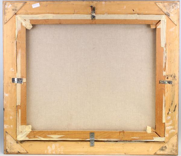 unsigniert, um 1970/80, Öl/Lwd., reich belebte Straßenszene in einer Kleinstadt wohl in Süddeutschland od. Frankreich, realistische, leicht naive Malweise mit klaren Konturen, in warmen, sommerlichen Tönen, in geschweiftem Stuckrahmen, verziert mit Rocaillen und floralem Ornament, 85 x 75 cm / 70 x 60 cm