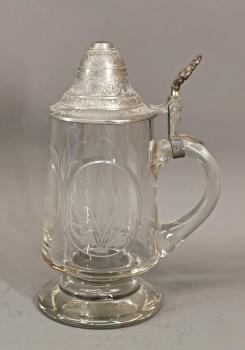 1915-1930, farbloses Glas, längsoptisch mundgeblasen mit ausgeschliffenem Bodenabriss, angesetzter Henkel, handgemalte, orange-weiße Beschriftung "Zur Erinnerung" in Email, florales Dekor in Emailmalerei, Zinnmontierung mit eingraviertem Ähren- und Hopfen-Dekor, Monogramm BZ und Mälzer- bzw. Brauerstern (auch Davidstern), H 17 cm