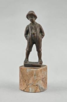um 1900/20. Metallguss versilbert, unsigniert, im Kontrapost stehender vollplastisch ausgeformter Herr, in der rechten Hand eine Kugle haltend, auch rechteckigem, facettiertem flachem Sockel geschraubt, Sockel an einer Stelle gedellt, Versilberung teils berieben, Altersspuren, H 17 cm, Sockel 13,5 x 8 cm