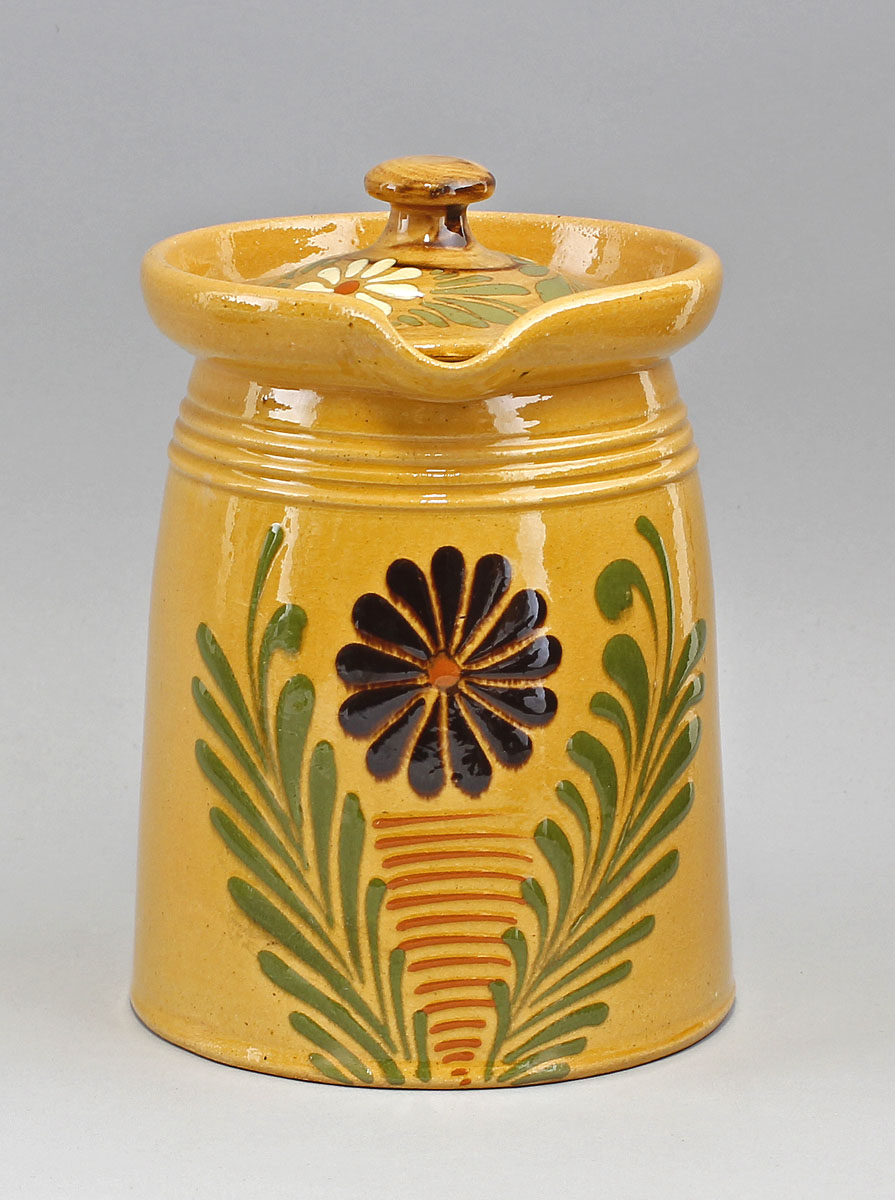 ungemarkt, wohl Thüringer oder Marburger Raum, 20.Jh., stilisiertes Floraldekor in Grün und Braun auf gelb glasiertem Fond, konischer Korpus mit seitlichem Henkel, Deckel, H 21 cm