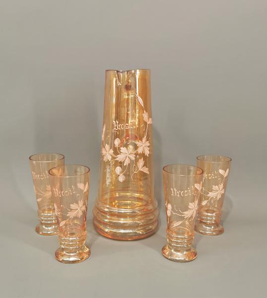 um 1890/1900, honiggelbes, lüstriertes Glas modelgeblasen, handbemalt mit Hopfendekor in weißer Emailfrarbe, bestehend aus Schenkkrug und 4 Bechern, teils Chips, H 31,5 und 15 cm