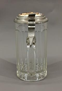 um 1900, Kristallglas formgepresst, reliefierter Zinnklappdeckel mit eingesetztem Porzellanmedaillon, dieses handbemalt mit Genreszene, H18,5cm