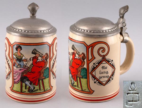 Pressmarke Marzi & Remy, Höhr, um 1920-50, beiger Fond, farbig handausgemaltes Biergartenmotiv, Trinkspruch "Der erste Zug nie lang genug", Zinnklappdeckel mit Widmung "Zur Vermählung 24.6.57 Konrad Schieber gew. v. Sportclub Gesees", H 16 cm