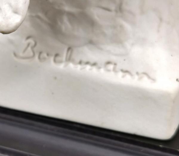Bisquit-Porzellan, gemarkt Goebel, Entwurf G. Bochmann, Büste des Komponisten Wolfgang Amadeus Mozart (1756-1791), lose auf geschwärztem, profiliertem Holzsockel, H 23 cm