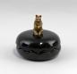 neuzeitliche Fertigung nach historischem Vorbild, Porzellan/Bronze, rundes Gefäß mit gewellter Mündung, Deckelgegenstück ebenfalls gewellt, darauf kleine Bronzefigur, naturgetreue Ausformung eines Bären, D 8,5 cm