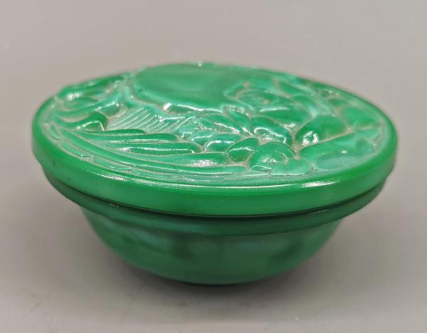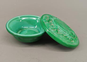 Dose Slevogt aus grünem Opalinglas formgepresst mit Rosendekor, 10,5 x 6 cm