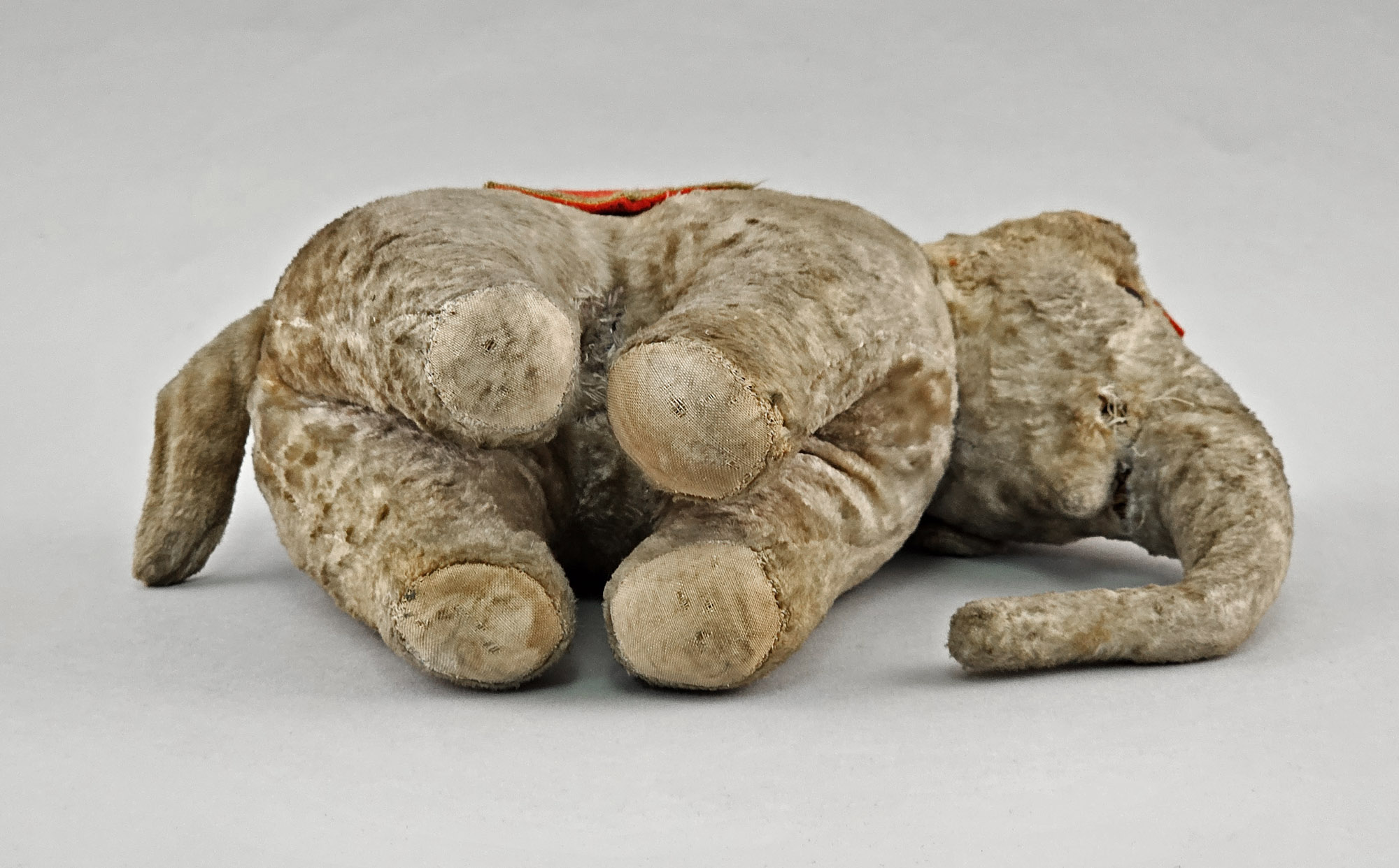 alt, Holzwolle gestopft, kurzes Mohairfell, Filzdecke, Glasaugen, keine Stoßzähne, ein Ohr fehlt, Fehlstellen, bespielt, 25x10x21cm