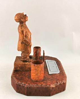 um 1930/50, Holz geschnitzt, auf rechteckiger Platte zwei zylindrische Gefäße sowie Streichholzschachtelhalter, auf erhöhtem Sockel stehende Figur eines rauchenden Mannes in grober Ausformung, Aschenbechervertiefung mit Bakeliteinsatz und loser Metallmontierung, bestoßen, Alters- und Gebrauchsspuren, 30 x 22 x 27 cm