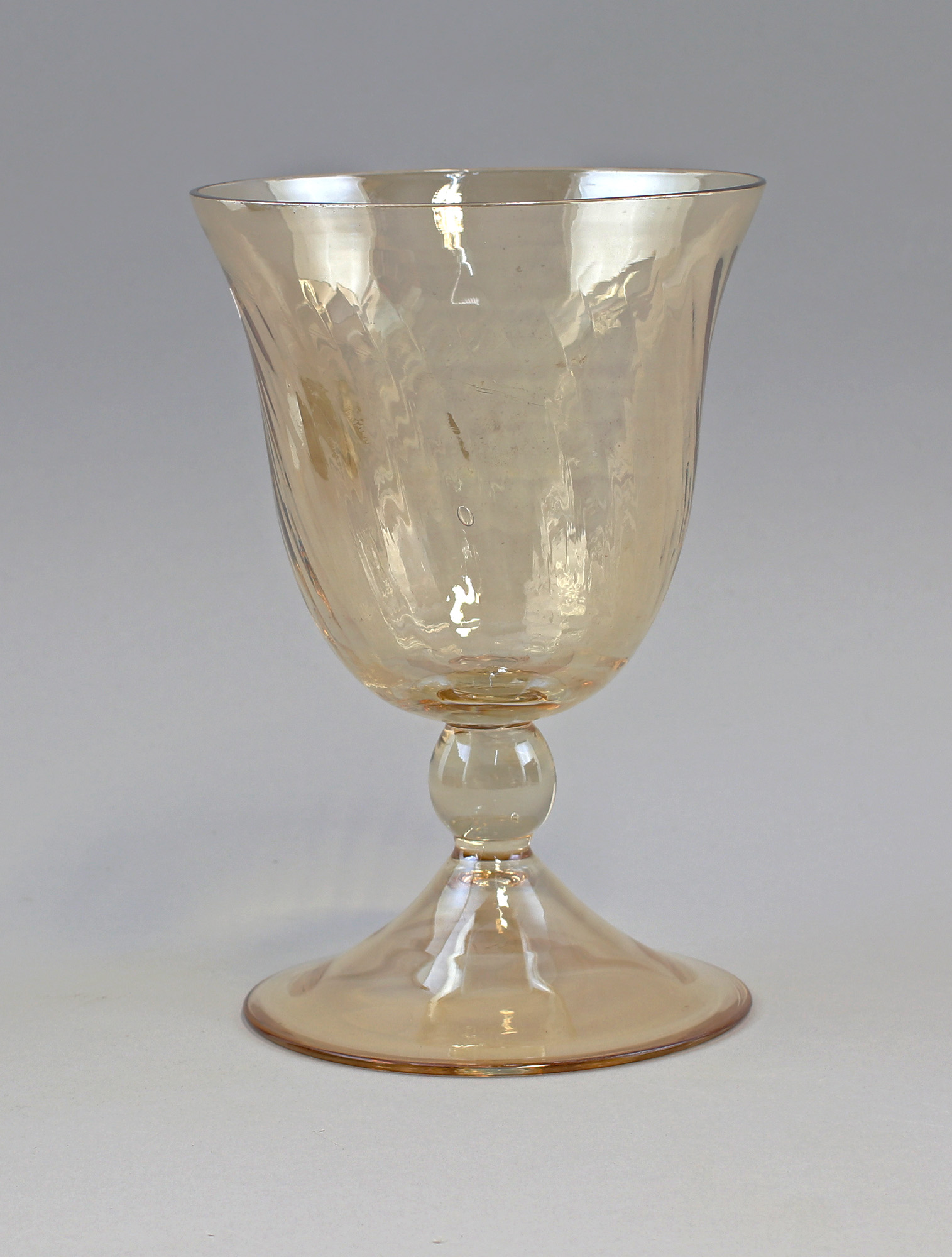 um 1925, Bayrischer Wald, bernsteingetöntes Glas formgeblasen und irisiert, H 19,5 cm