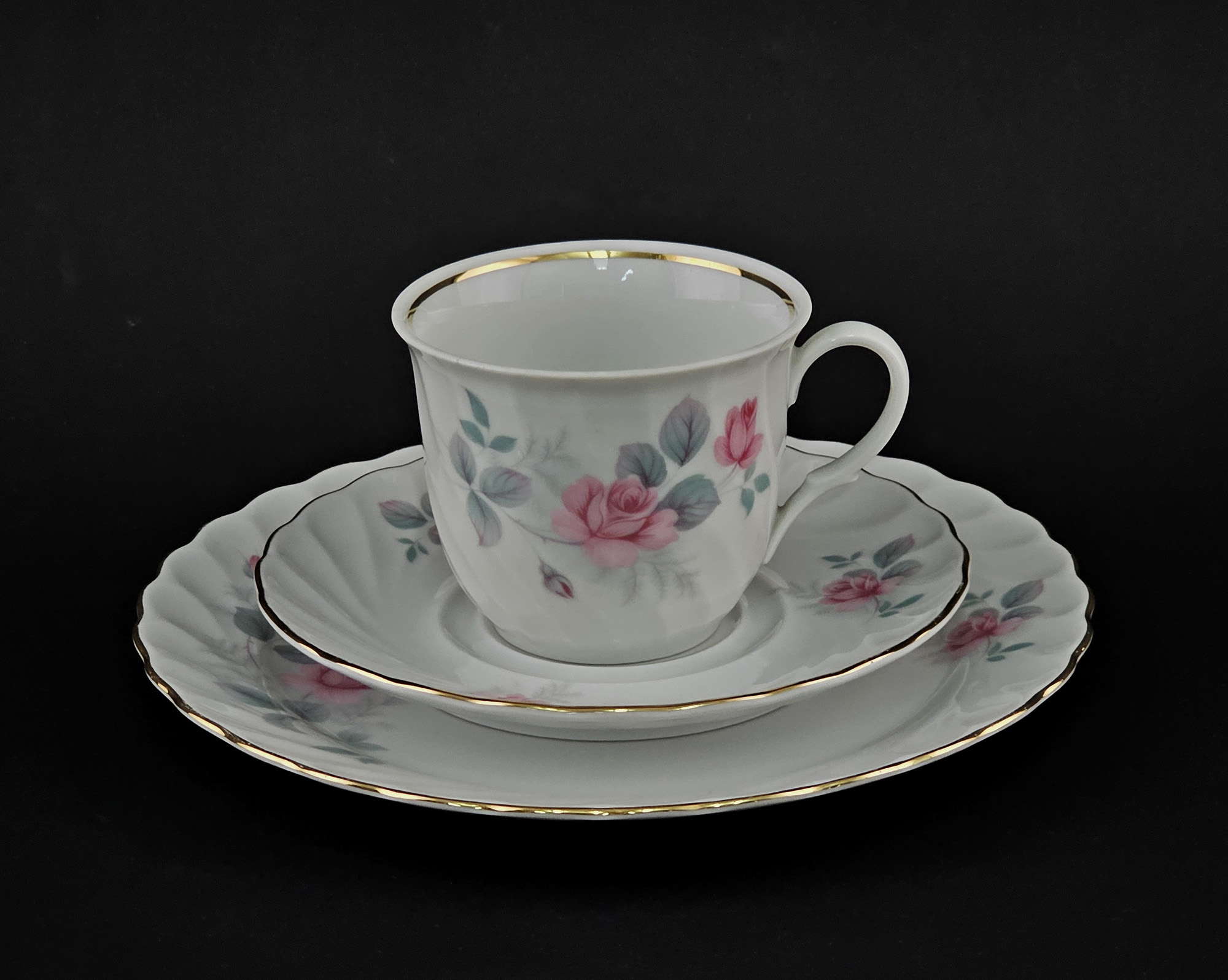 gemarkt Schirnding Bavaria, pastelltoniges rosendekor in Rosa und Grau, Goldrand, Kuchenteller D 19 cm, Tasse 10 x 6,5 cm