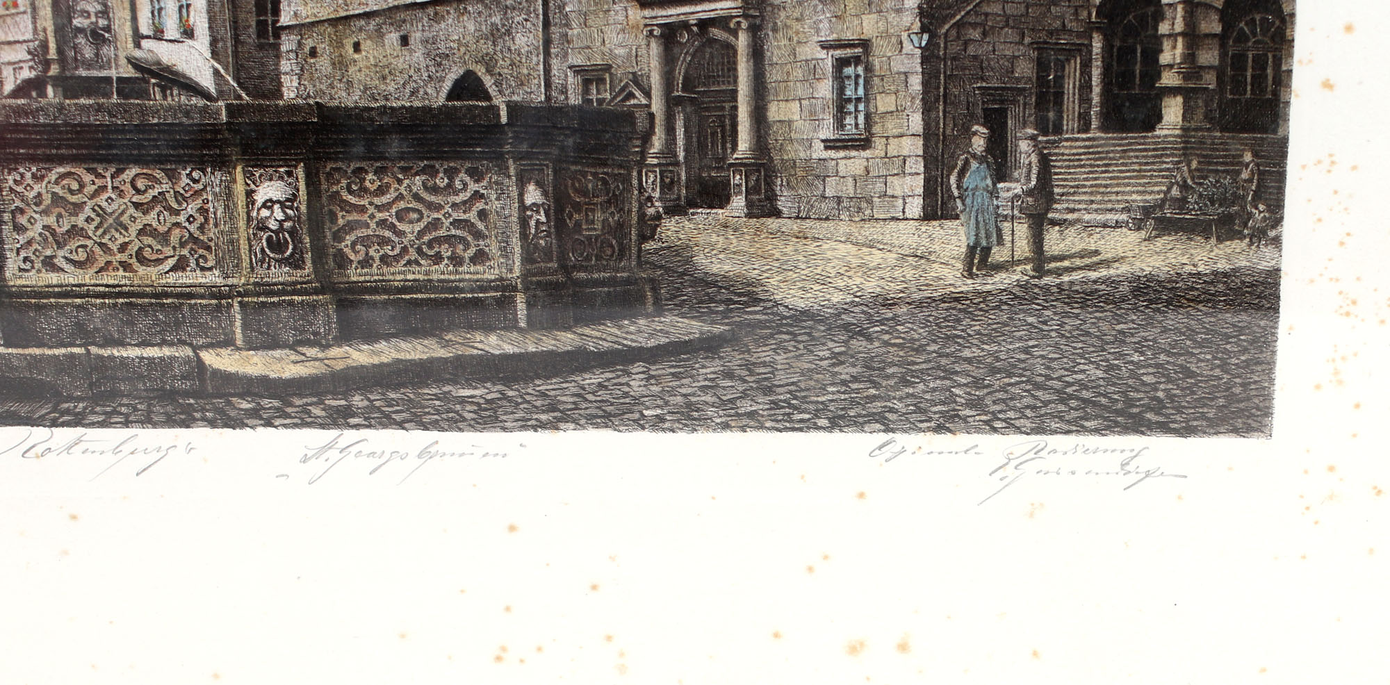 Orig.-Rradierung, aquarelliert, re. u. von Hand sign. "Geissendörfer", Ernst Geissendörfer, verz. in arprice.com, 1908-1993, dt. Maler und Grafiker, Studium in Nürnberg, schuf zahlreiche Ansichten seiner Heimatstadt Rothenburg o.d. Tauber, Blatt stockfleckig, hinter Glas, in silberfarbenem Profilleistenrahmen, 72 x 60 cm / Platte 50 x 43 cm