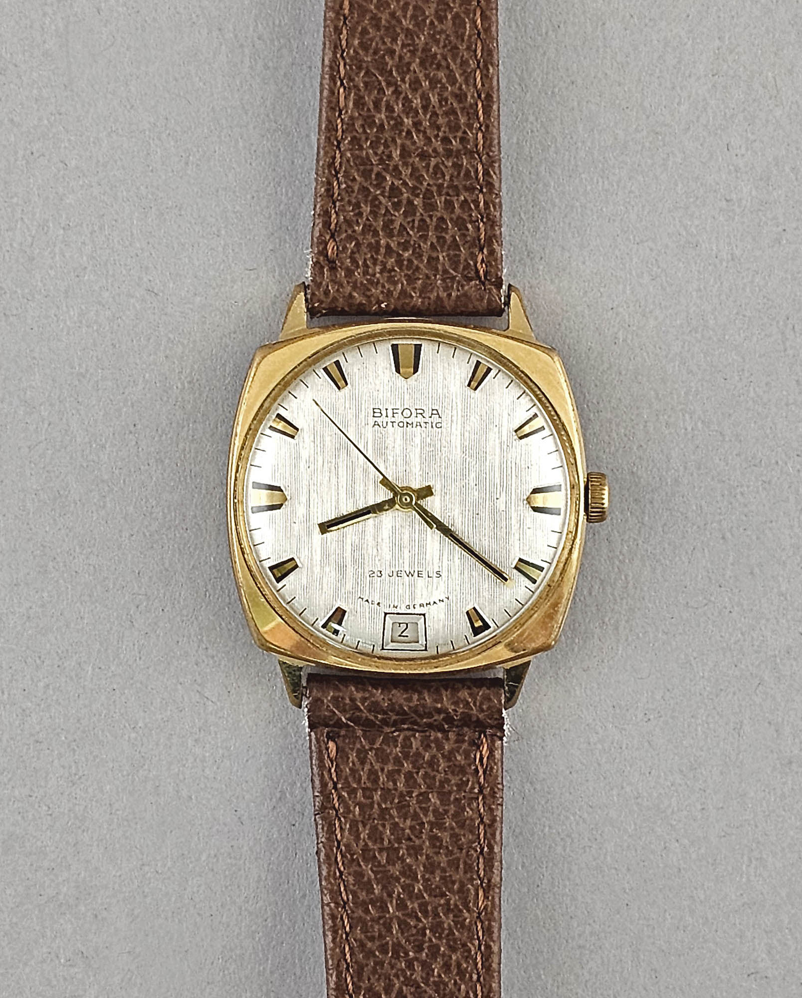 Made in Germany (Bifora, Schwäbisch Gmünd um 1960), helles Zifferblatt mit goldfarb., aufgesetzten Ziffer-Indexen, zentrale Sekunde, Kalender auf 6 Uhr, bez. "Bifora, Automatic, 23 Jewels, Made in Germany", Gerhäuse vergoldet, Deckel Edelstahl, bez. "Waterprotected, Antimagnetic, Antichoc, Steel Back, Automatic", an Lederarmband (brüchig), Werk läuft, D 32 mm, Alters- und Gebrauchsspuren