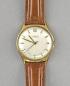 Made in Germany, um 1960/70, helles Zifferblatt mit goldfarb. Ziffer-Indexen, zentrale Sekunde, bez. "Junghans, 17 Jewels", mech. Werk mit Handaufzug, vergoldetes Gehäuse mit Edelstahlboden, an Lederarmband, D 32 mm, Alters- und Gebrauchsspuren