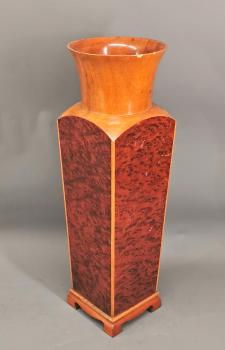 Edelholz/Vogelaugenahorn-Furnier, vierpassiger Korpus auf Standring mit Füßchen, ausgestellte, runde Mündung, innen festsitzender Glaseinsatz, Alters- und Gebrauchsspuren, 13x13x48cm