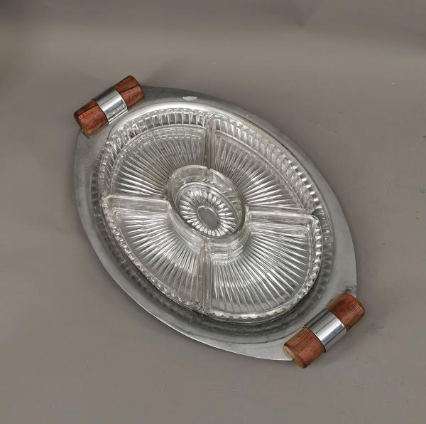 um 1930/50, Metall vernickelt, flach gemuldetes ovales Tablett, massive Holzhandhaben, 5 Pressglassegmente mit maschinengeschliffenem Dekor, mittleres ovales Segment mit durchgehendem Riss, gering bestoßen, Alters- und Gebrauchsspuren, 43 x 28 cm
