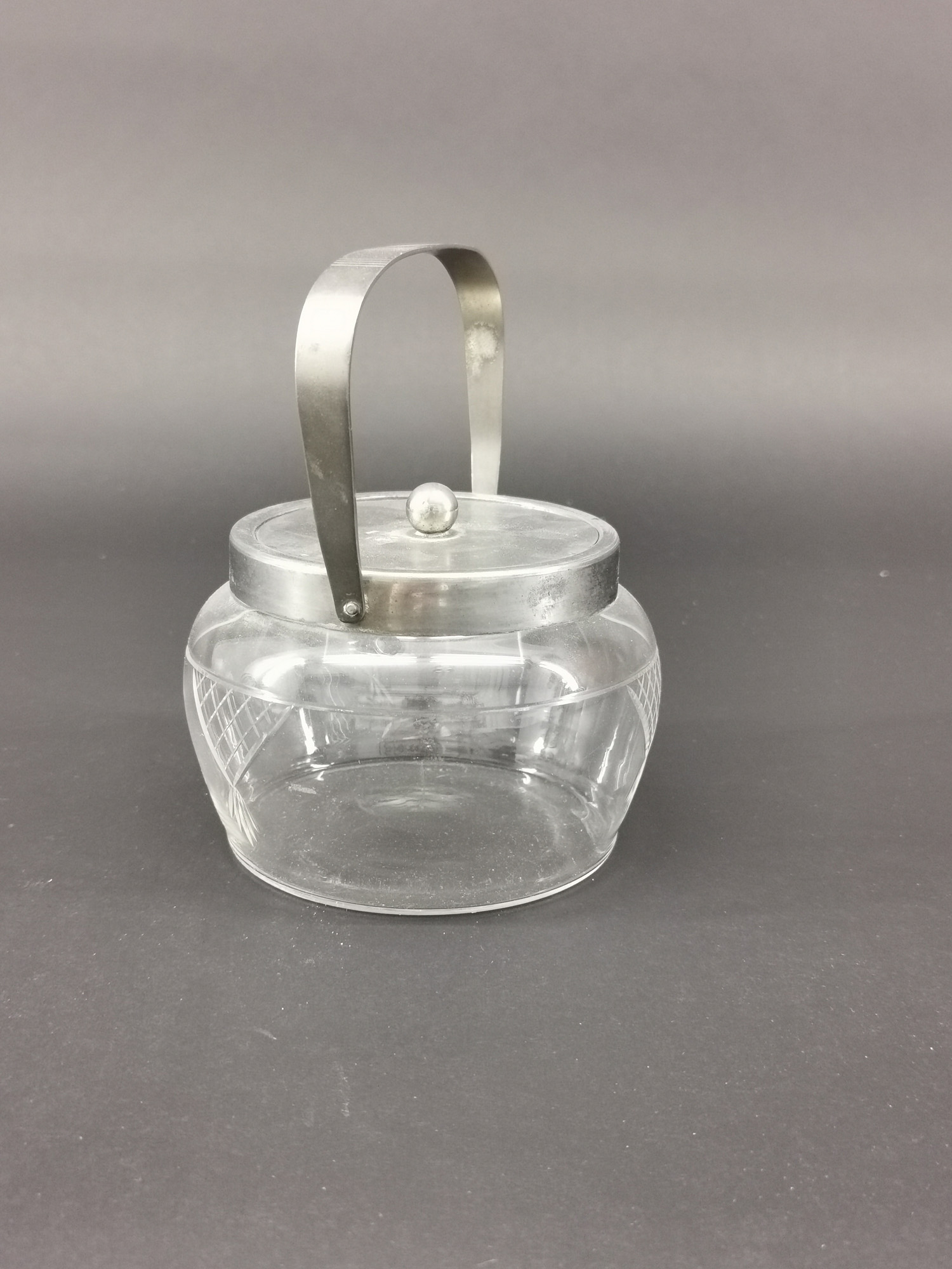 um 1930, farbloses Glas, handbeschliffen mit geometrsichem Dekor, silberfarbene Metallmontierung mit Korrosionsspuren, 13x16cm