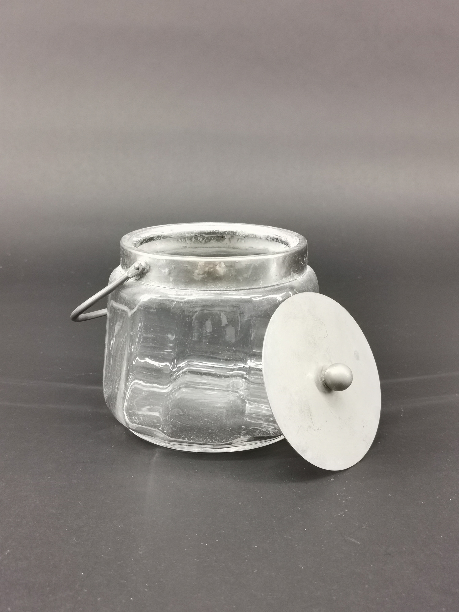 um 1930, farbloses Glas, längsoptisch foemgeblasen, silberfarbene Metallmontierung mit Korrosionsspuren, 12x16cm