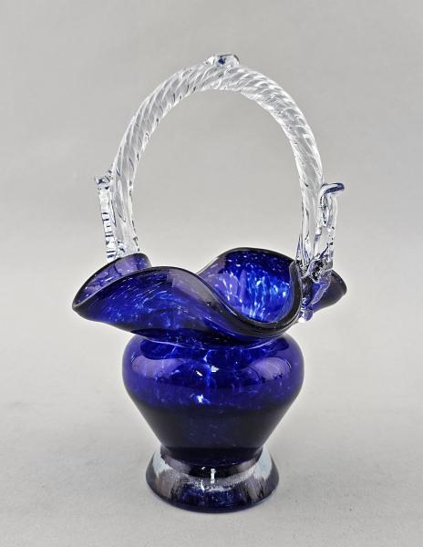 dickes farbloses Glas, kobaltblaue, schlierige Einschmelzungen, gegliederter Korpus mit gebörteltem Rand, farbloser Henkel mit Aufschmelzungen, mundgeblasen mit Bodenabriss, 12x13x21cm