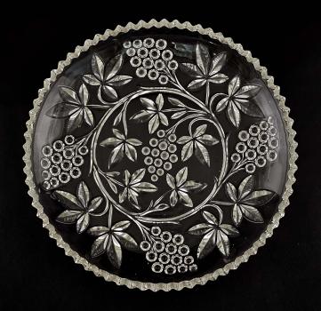 farbloses Glas formgepresst und handgeschliffen mit geometrischem Dekor, gezackter Rand, D31cm