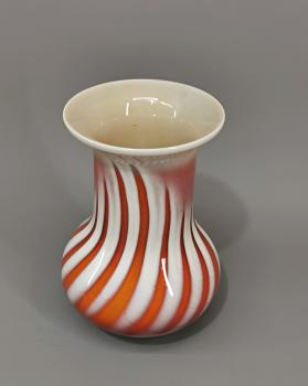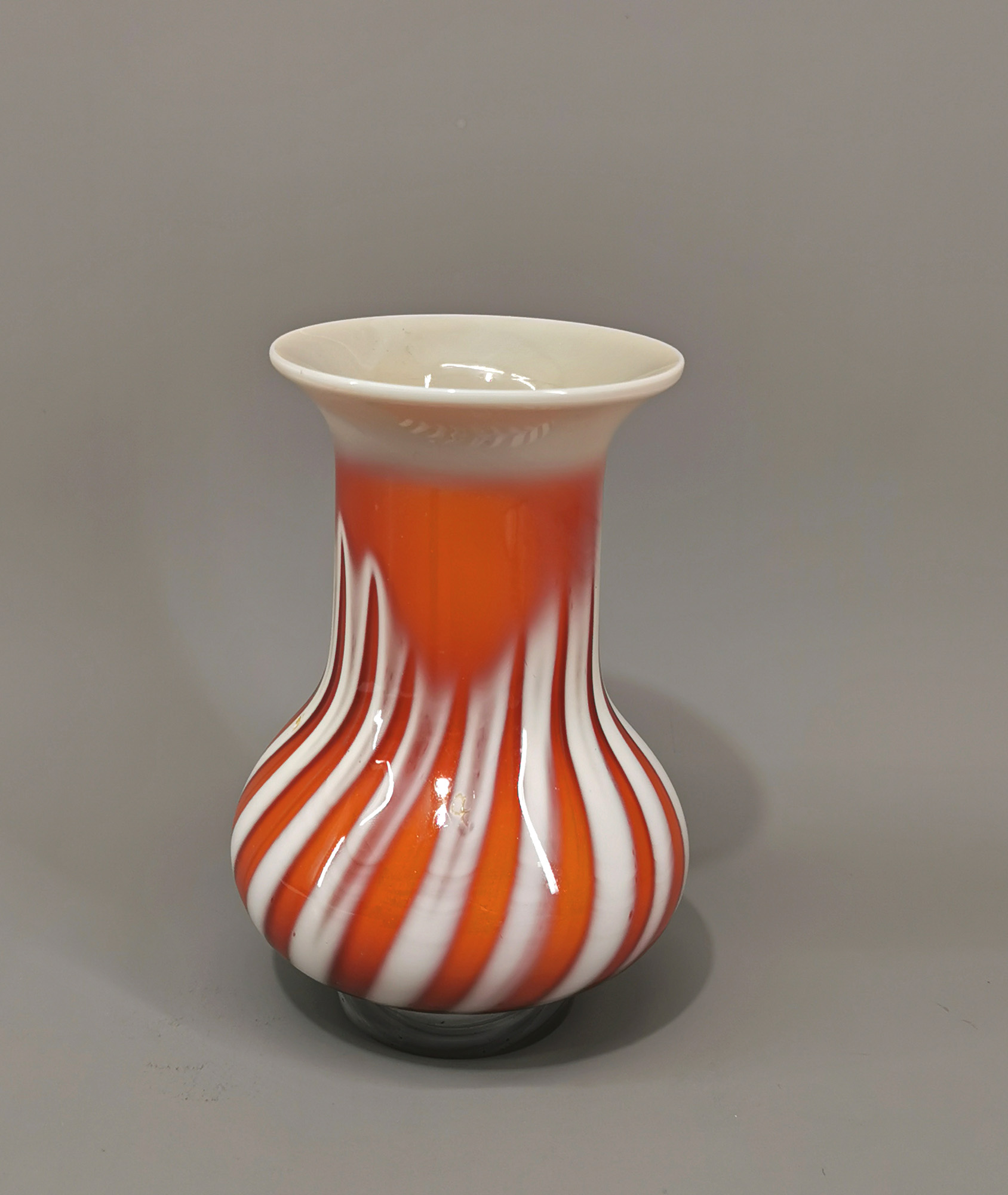 aus dickem farblosem Glas mundgeblasen mit Bodenabriss, weiß und orangebraun verdreht unterfangen, H19cm
