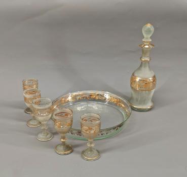 19.Jh., farbloses Glas mundgeblasen mit Bodenabriss, partiell mattierte Oberfläche, florale Goldmalerei, berieben, bestehend aus Karaffe, 5 Kelchgläsern und einem Tablett, H 23,5cm