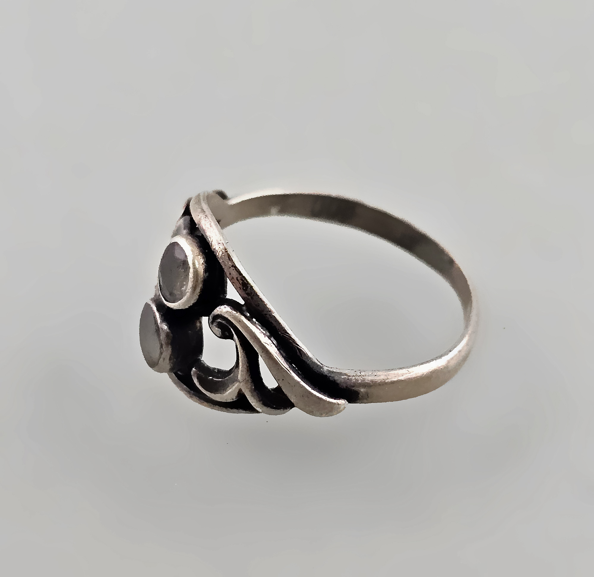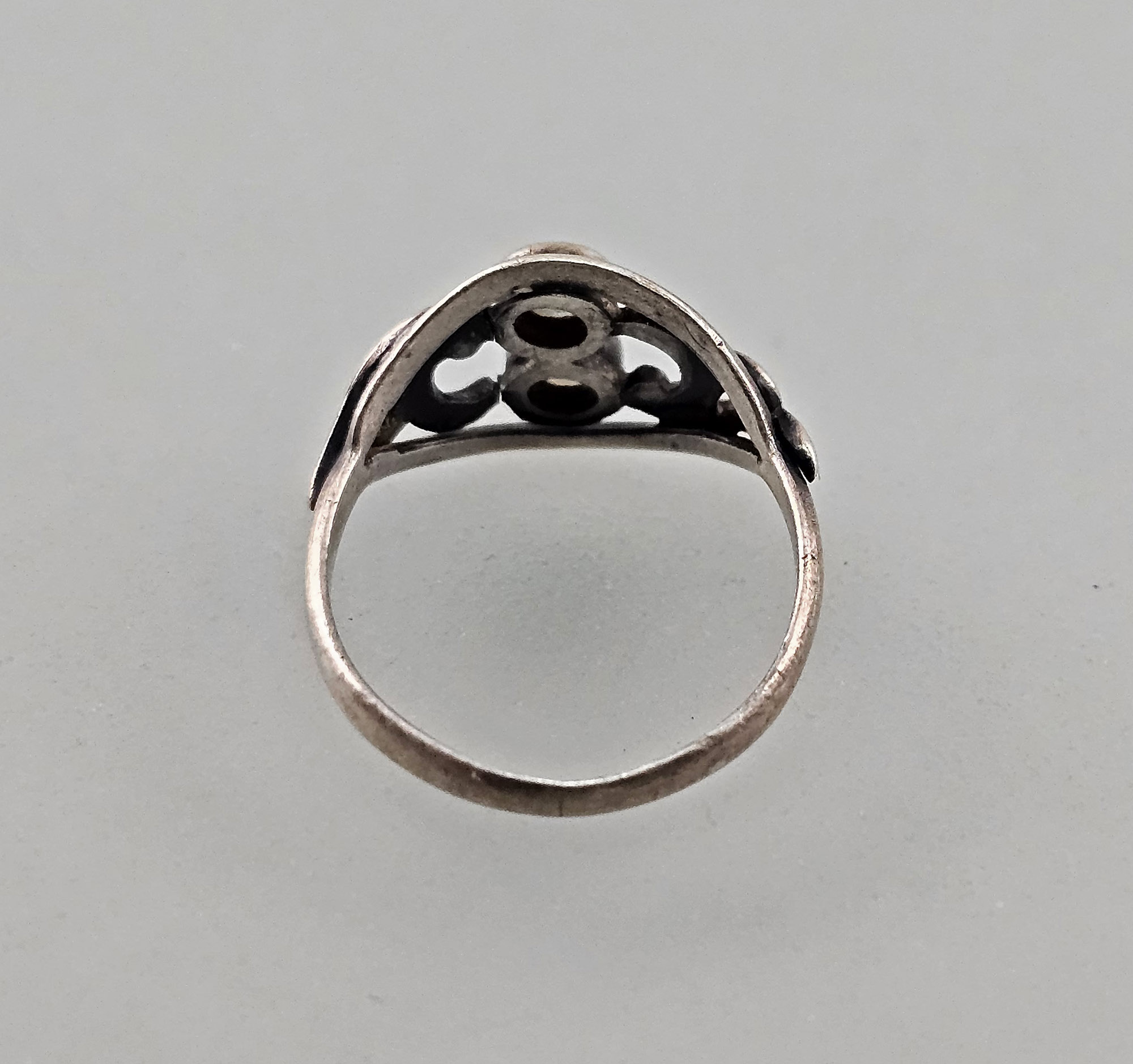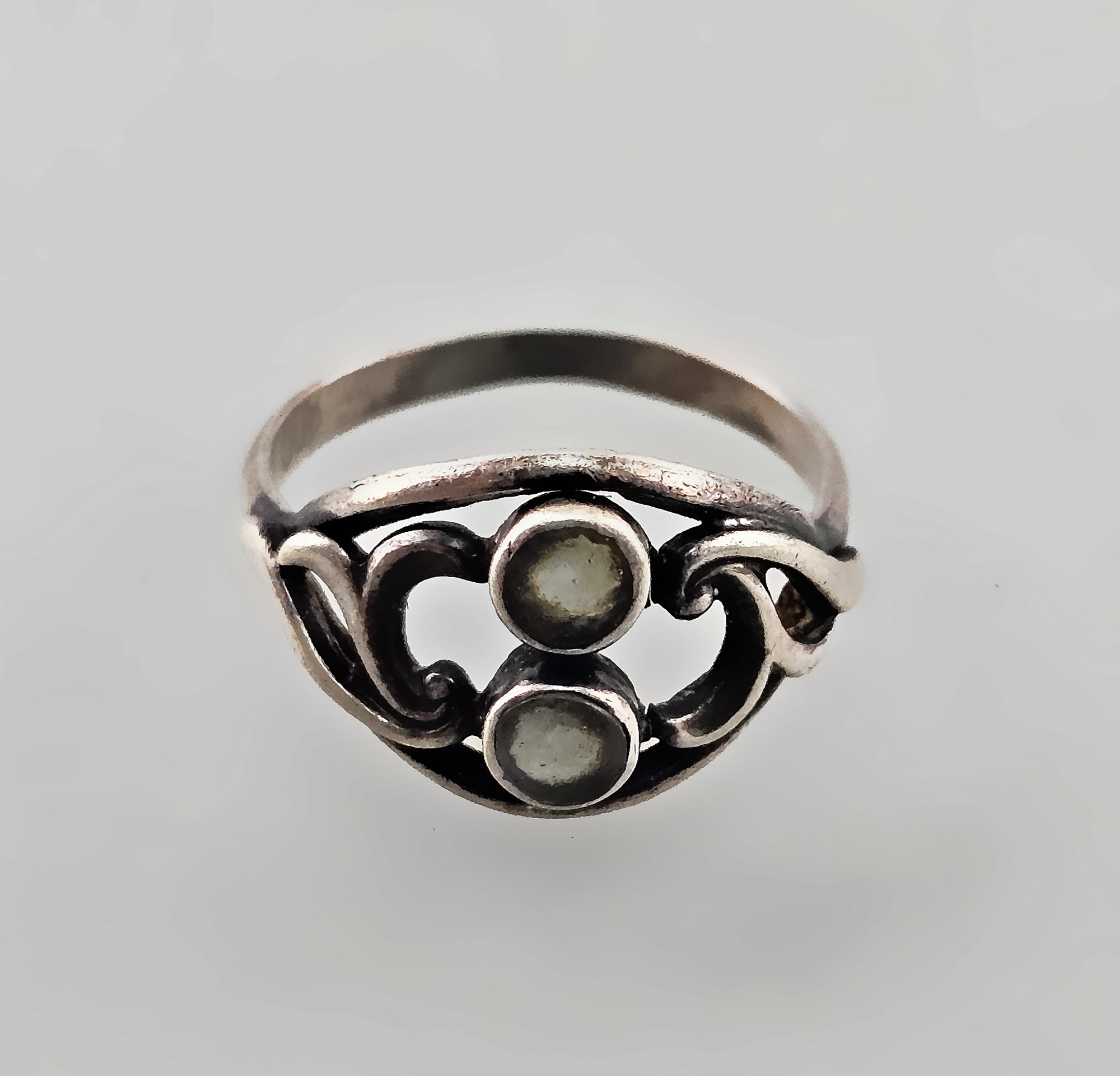 800er Silber, 1,6 g, durchbrochen ornamental gestalteter Ringkopf, dort mit 2 runden milchig-farblosen Steinen un Zargenfassung besetzt, Gr. 49