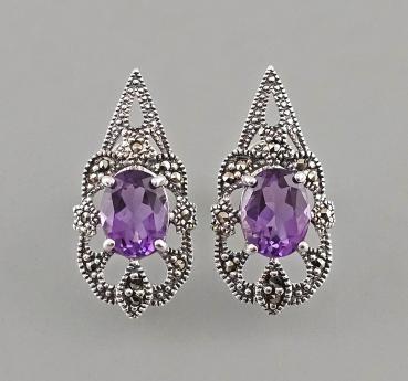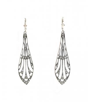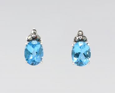 925er Silber, zus. 5,15 g, neu gefertigt nach historischem Vorbild, hochwertige Manufakturarbeit, Ohrstecker mit floraler Abhängung, 2 mandelförmige Blätter jeweils mit Swarovski-Markasiten besetzt, darunter tropfenförmig facettierter Blautopas in Zargenfassung, ganz oben ein weiterer kleiner rund facettierter Blautopas, L 2,8 cm, passend dazu Collier unter anderer Artikelnummer
