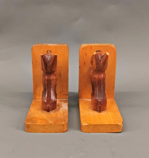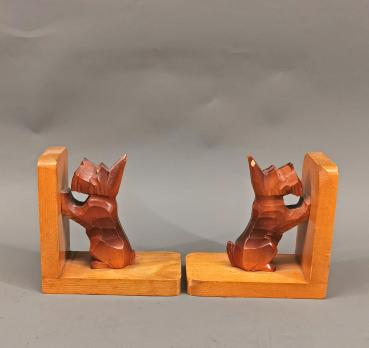 um 1960/70, Holz geschnitzt, auf den Hinterbeinen stehende Terrier in grober Ausformung, teils bestoßes, Alters- und Gebrauchsspuren, 13 x 7 x 13 cm