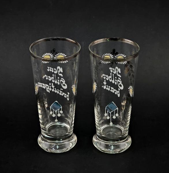 um 1900, farbloses Glas, emailbemalt, Silberrand, Aufschrift und Dekor passend zur Silberhochzeit, H14,5 cm