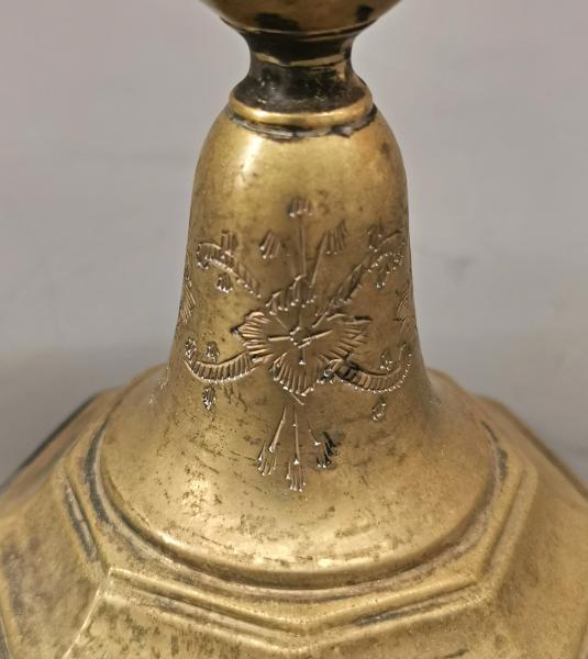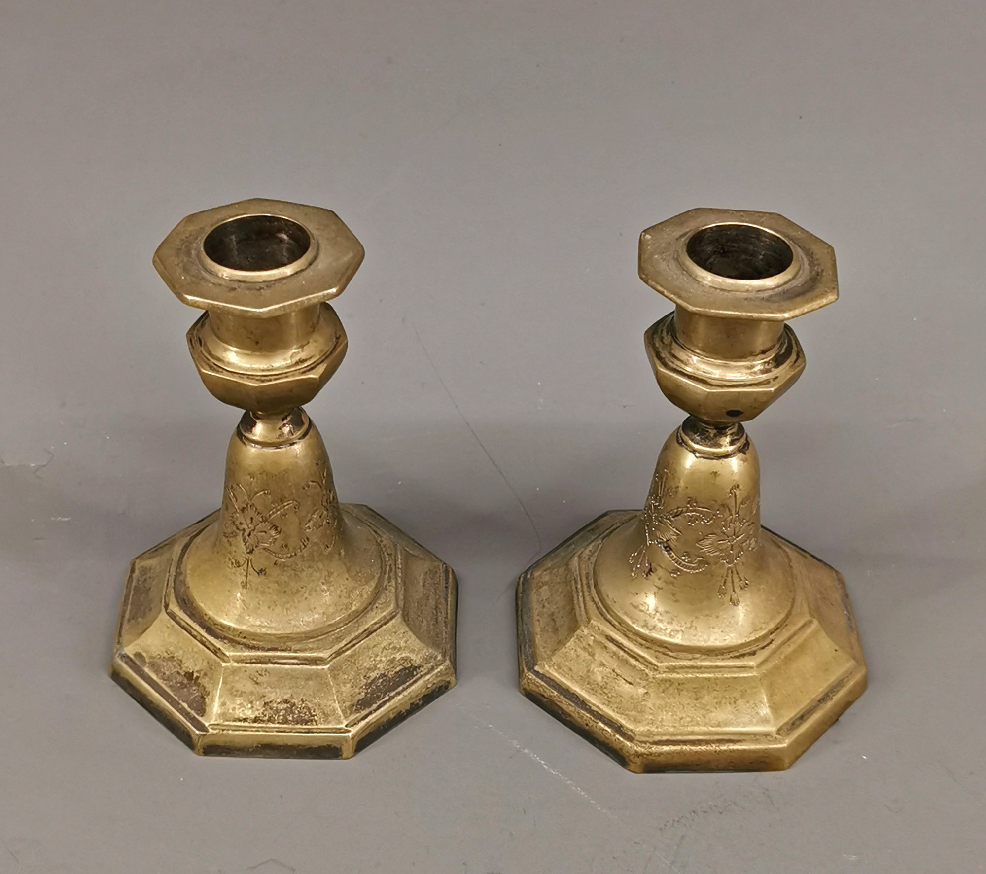 Mitte 19. Jh., Messing, achteckig facettierter Stand, Balusterschaft mit floralen Gravuren, etwas berieben, Alters- und Gebrauchsspuren, 8,5 x 8,5 x 12 cm