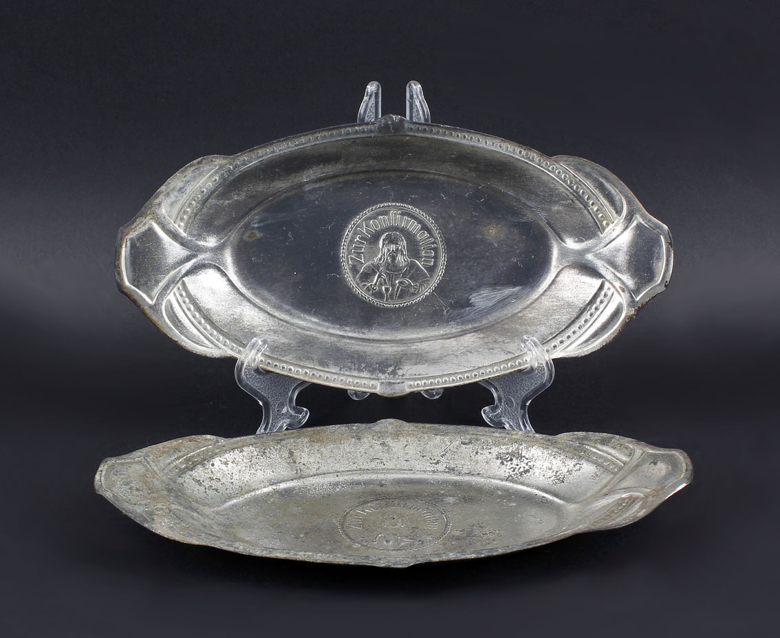 versilbert, 20. Jh., am Boden undeutlich gemrarkt, flach gemuldete ovale Schälchen, Fahne an den kurzen Seiten mit geometrischen Ornament verziert, umlaufend Perlbandrelief, im Spiegel Christus-Halbrelief und Aufschrift "Zur Konfirmation", Silberauflage teils berieben. Alters- und Gebrauchsspuiren, 21 x 11 cm