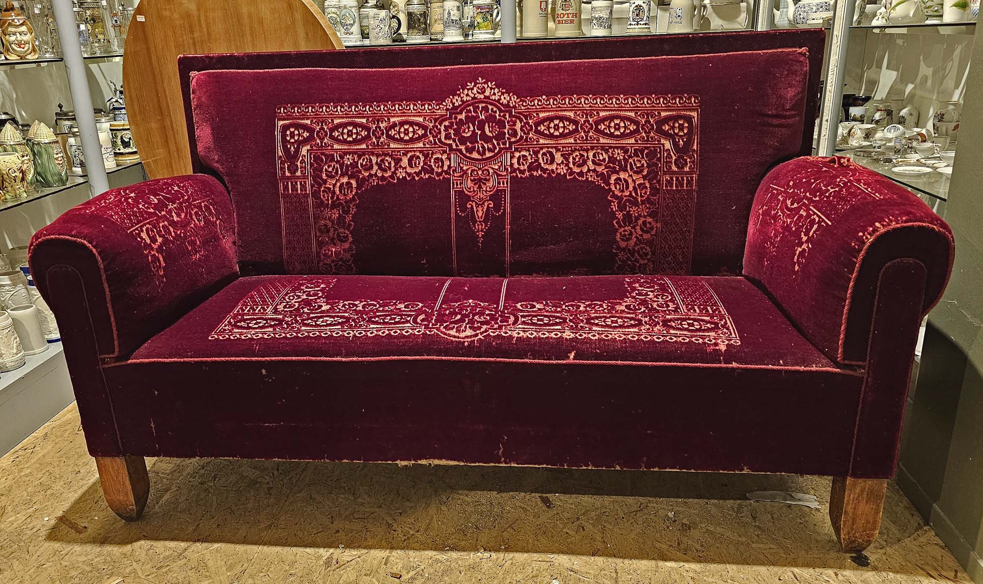 um 1900, mit geprägtem Plüschsamt bezogen, Fehlstellen, 2-teilig, original Polster, 76 x 187 x 106,5 cm, Sitzhöhe 50 cm, ein Bein lose, überarbeitungsbedürftig, Alters- und Gebrauchsspuren, KEIN VERSAND MÖGLICH! Bitte geben Sie beim Checkout die Option "Selbstabholung" an. Dieser Artikel wird nicht versendet. Bei der Option "Deutsche Post" kommt kein Kaufvertrag mit Lieferung zustande. Sie können diesen Artikel nur abholen oder eine Spedition mit der Abholung beauftragen. Gern empfehlen wir Ihnen ein Unternehmen, mit dem wir seit langem gut zusammenarbeiten.