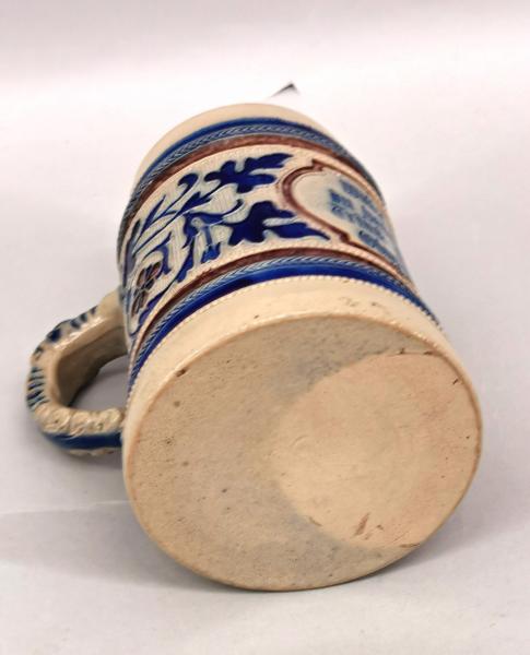ungemarkt, Westerwald, alt, graue Salzglasur, braune und kobaltblaue Bemalung, Reliefdarstellunegn, Sinnspruch "Willst vom Bier Du haben Spass Trink fürsichtig Glas für Glas", H13,5cm, Harriss in der Wandung, Alters- und Gebrauchsspuren