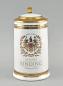 Porzellan ungemarkt, Wandung farbig bedruckt, Zinnklappdeckel mit Porzellaneinsatz, 11x15x21cm