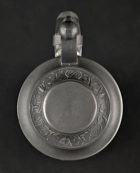 farbloses Glas formgepresst, Wandung farbig bedruckt, Zinnklappdeckel reliefiert, 10x15x22,5cm