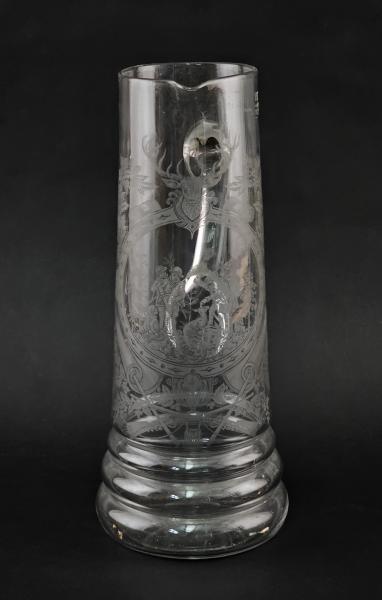 19.Jh., farbloses Glas, ausgeschliffener Bodenabriss, Dekor Jagdszene, H Kanne 40 cm, Gläser H 17 x 7 cm