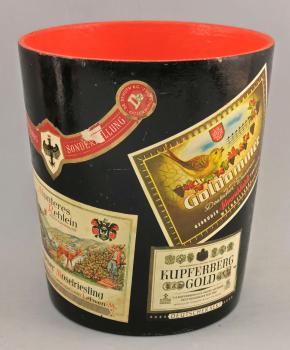 um 1950/60, beklebt mit Reklameabbildungen/Flaschenetiketten, innen rot und außen schwarz bemalt, Farbabplatzer, Alters- und Gebrauchsspuren, am Boden Prägemarke und Modellnummer 5592, 20x22cm