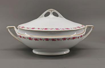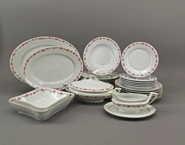 ungemarkt, um 1900-20, farbiges Rosendekor, Goldstaffage, teils berieben, bestehend aus: große Terrine (39x22x20cm), kleine Terrine, Sauciere, 2 Schüsseln, 2 Ovale Vorlegeplatten, 6 Speise-, 6 Suppen- und 6 Salatteller, Alters- und Gebrauchsspuren