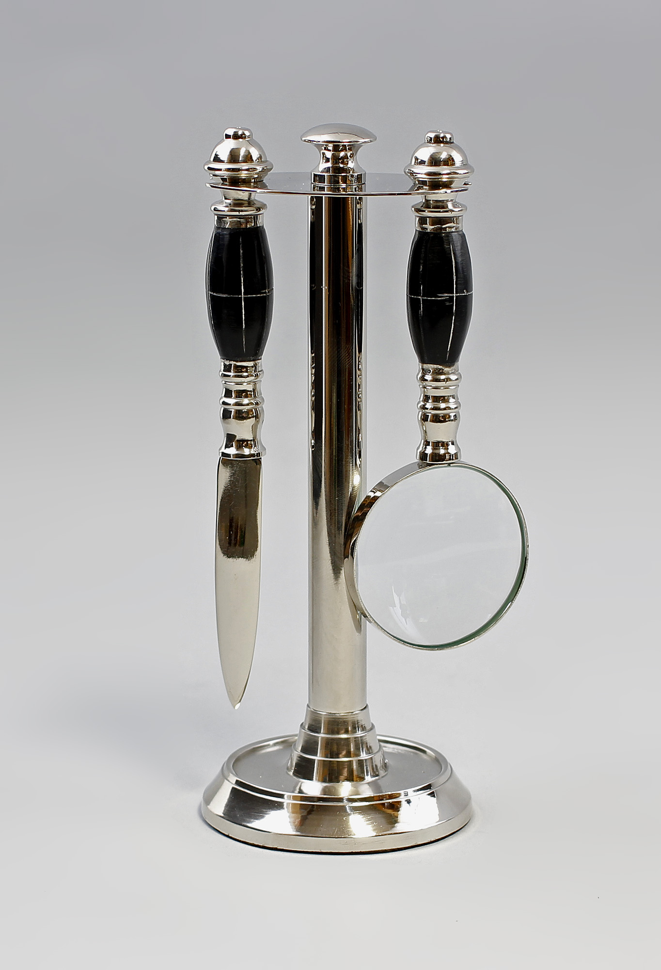 vernickelt, Kunststoffgriff, Ständer mit Lupe und Brieföffner, H 19 cm