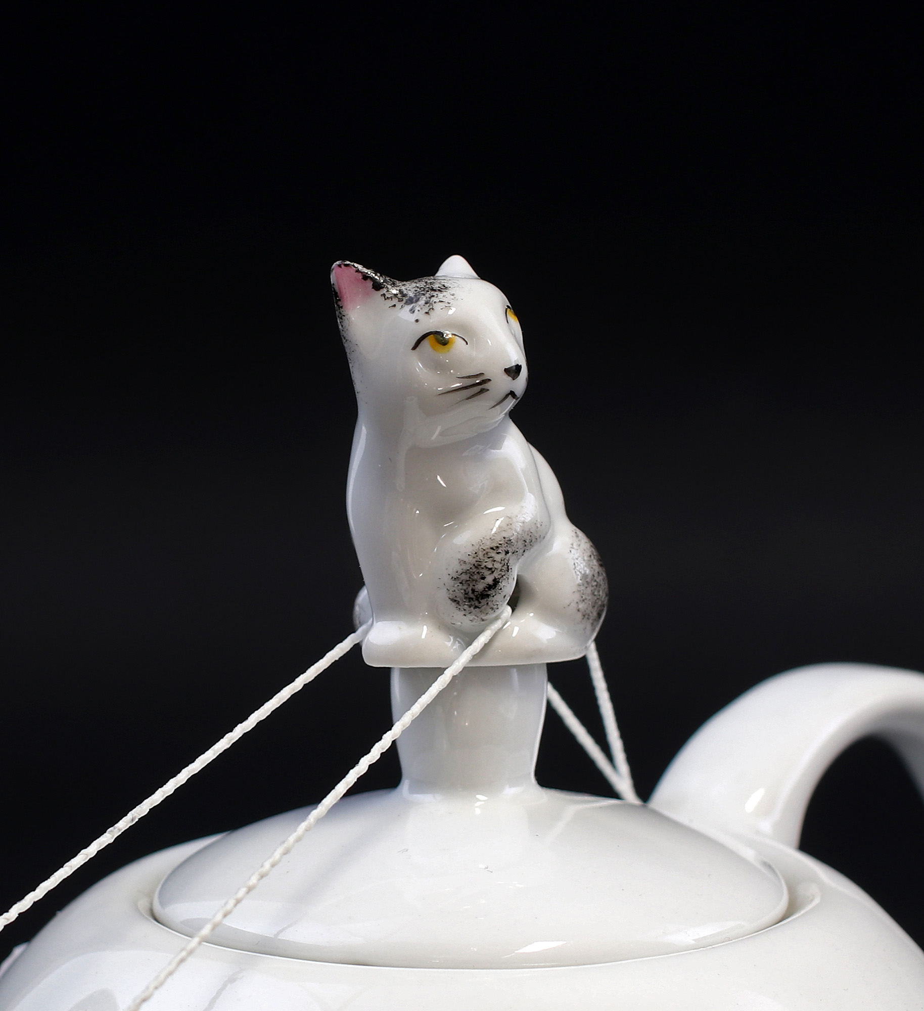 gemarkt Lindner-Porzellanfabrik, Küps, Bayern, Tropfenfänger aus Weißporzellan in Gestalt einer Katze, aufglasur handbemalt, 4 cm